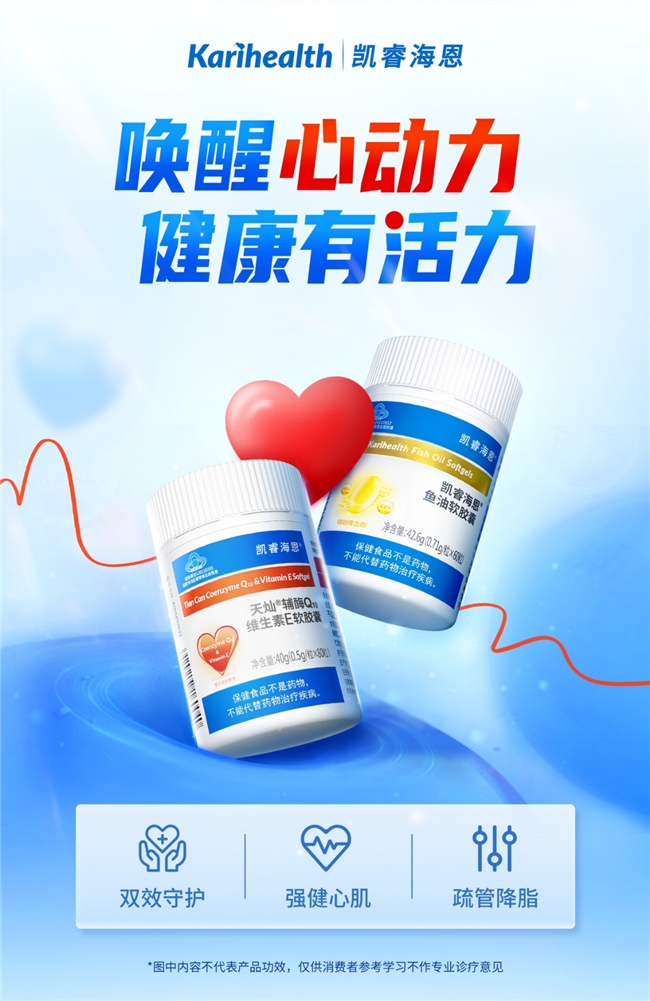 心血管健康的核心基础在于“心肌动力充足+血管通道通畅”,而凯睿海恩品牌旗下辅酶Q10维E软胶囊与鱼油软胶囊,两款产品的设计恰好精准覆盖这两大关键环节,以“强心泵+清血管”的科学组合,为广大消费者提供可落地、可持续、高质价比的心血管养护方案。